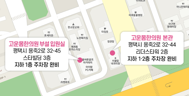 ![]() - 본 건물 지하주차장(2층까지) * 지하주차장이 협소하여 대형차량은 주차가 힘들 수 있습니다. 주차 관련 문의는 전화로 연락주세요(031-655-1075) - 부설 입원실 건물(스타빌딩) 지하주차장(1층) |